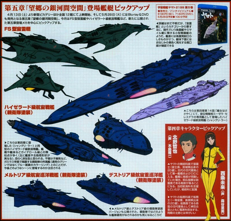 Uchū senkan Yamato 2199 (in Italia Space Battleship Yamato) del mitico Leiji Matsumoto, creatore tra gli altri degli anime Capitan Harlock e Galaxy Express 999, è una serie televisiva anime del 2012. L'anno scorso è uscito un film animato per il cinema: Star-Voyaging Ark.